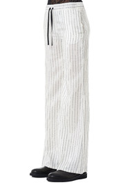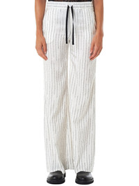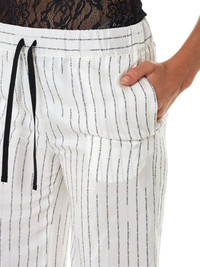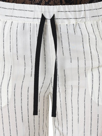 Unravel Project relaxed-fit lounge trouser in ivory white, jacquard logo “pinstripe” detailing, mid-rise fit, elasticized waist, contrast-color drawstrings, narrow turn under bottom hem, tonal stitching. Made in Italy. Composition - 100% Silk Model wears a size S.