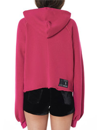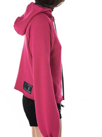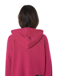 Ben Taverniti Unravel Project hooded pullover in pink, raglan construction, ripped neck detailing, grosgrain drawstrings, printed branding at hood edge, contrast striping at side seams, center-back darting, woven brand patch above rear hem, uneven destroyed hem, ribbed cuffs, tonal stitching. Made in Italy. Composition - 93% Cotton, 7% Cashmere; 95% Cotton, 5% Elastane (Ribbing) Model is 5ft 10” and wearing a size S. Bust: 32” Waist: 26” Hip: 31.5”