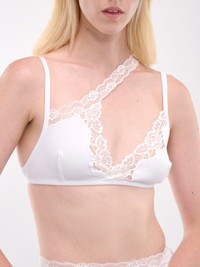 VAILLANT bra in white, paneled jersey construction, asymmetric lace trim throughout, asymmetric neckline, cross-strap, spaghetti straps, sleeveless, armscyes, side logo, back hook-eye closure, straight hem, slim fit. Made in Poland 73% Organic Cotton 25% Recycled Cotton 2% Elastane Model is 5'11" wearing size 36. Bust: 31.5" Waist: 25" Hips: 36"
