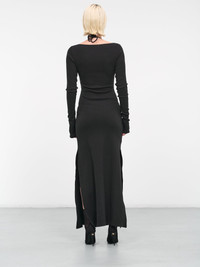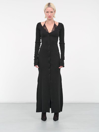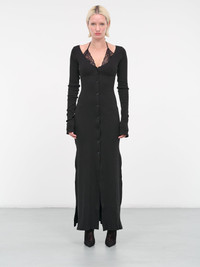 VAILLANT black dress, layered design, stretch cotton construction, integrated lace halterneck, back self-tie fastening, low-cut v-neckline, front button closure, elongated sleeves, side slits, maxi-length, slim fit. 95% Organic Cotton 5% Elastane French Sizing Model is 5'9" wearing size 36. Bust: 32" Waist: 24" Hips: 34"