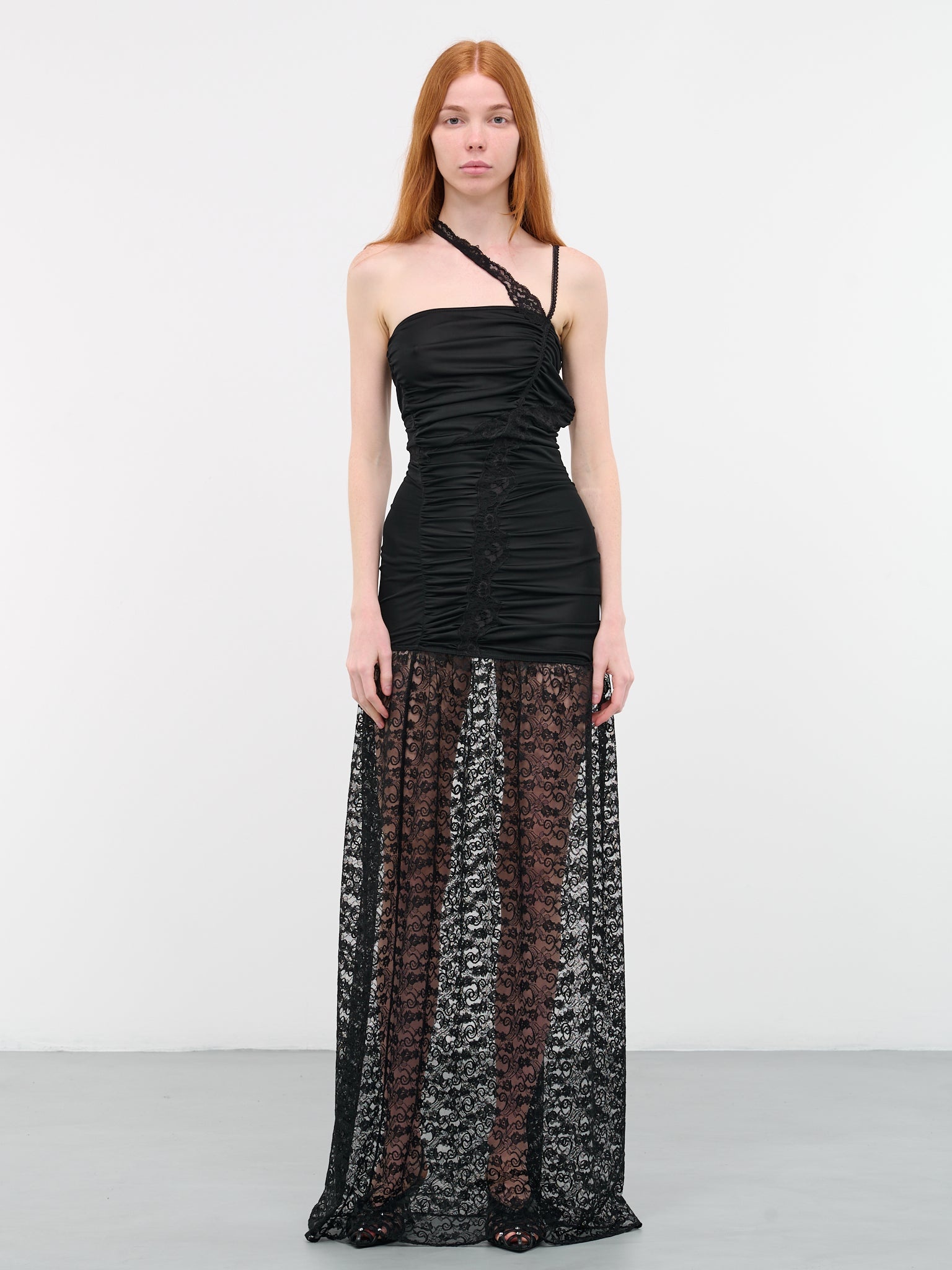 VAILLANT dress in black, paneled ruched bustier design, flared silhouette, lace detailing, straight neckline, asymmetric straps, maxi length, fitted. Made in Poland Italian Sizing 100% Viscose Model is 5'9" wearing size 36. Bust: 31.5" Waist: 23" Hips: 34"