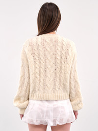 VAILLANT sweater in white, alpaca-poly blend, paneled knit construction, cable knit & contrast lace patterned paneling, ribbed crewneck, long sleeves, rib-knit cuffs & hem, straight hemline, relaxed fit. Made in Turkey 77% Baby Alpaca 23% Polyester French Sizing Model is 5'7" wearing size 36. Bust: 30" Waist: 24" Hips: 35"
