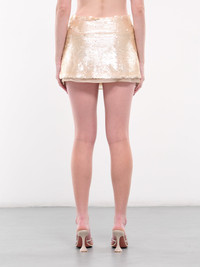 VAILLANT skirt in pearl, paneled sequin construction, asymmetric lace paneling throughout, high waist, side concealed zip closure, exposed lining, straight hem, slim fit. Made in Poland Outer: 100% Polyester Inner: 57% Recycled Polyester 43% Polyester Model is 5'11" wearing size 36. Bust: 31.5" Waist: 25" Hips: 36"