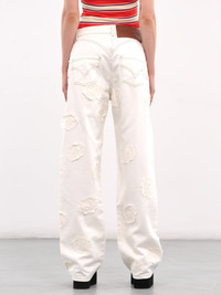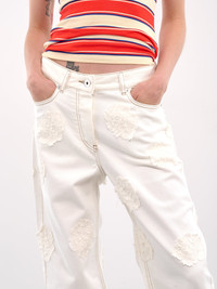 VAILLANT jeans in white, paneled denim construction, all-over lace patches, contrast topstitching, belt loops, back logo patch, front button & concealed zip fly closure, inset pockets, coin pocket, back patch pockets, lined, wide leg, relaxed fit. Made in Morocco Outer: 100% Organic Cotton Inner: 100% Cotton French Sizing Model is 5'9" wearing size 36. Bust: 32" Waist: 23" Hips: 34"