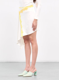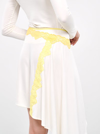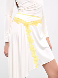 VAILLANT skirt in white & yellow, asymmetric design, paneled cupro construction, fitted waistband, asymmetric lace trim, asymmetric draped hem, mini-length, relaxed fit. Made in Poland 96% Cupro 4% Elastane European Sizing Model is 5'8" wearing size 36. Bust: 32" Waist: 26" Hips: 34.5"