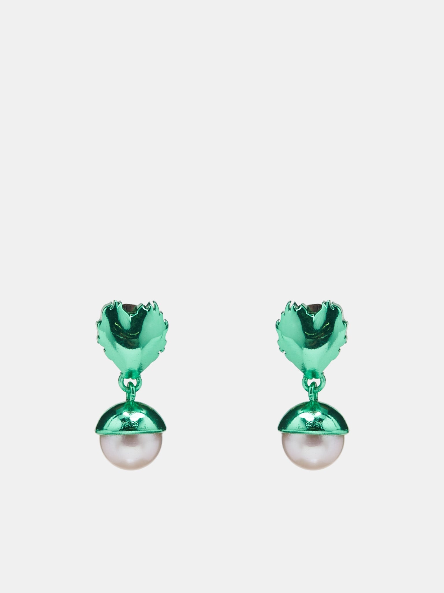 VEERT green earrings, handmade, drop design, flame heart, .925 sterling silver, 18k gold vermeil, PVD coating, freshwater pearls, stamped logo, pin-back fastening, velvet pouch included. Made in Italy .925 Sterling Silver, 18K Gold Vermeil, Freshwater Pearl