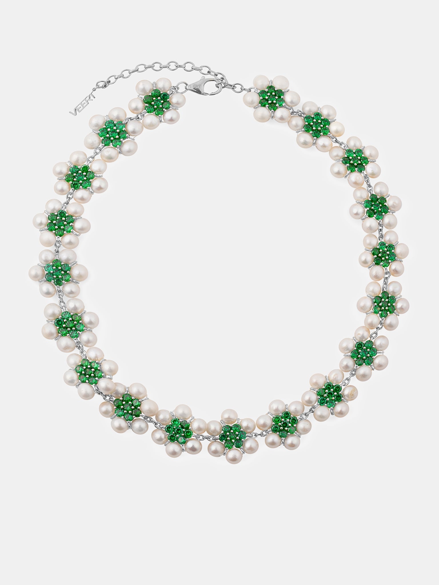 VEERT necklace in silver & green, handmade, 925 sterling silver construction, 18K white gold vermeil, flower pendants, zirconia encrusted, pearl embellishment, adjustable chain, logo plaque, lobster claw clasp closure. Made in Italy 60% 925 Sterling Silver 20% 18K Gold Vermeil 10% Freshwater Pearls 10% Zirconia One Size