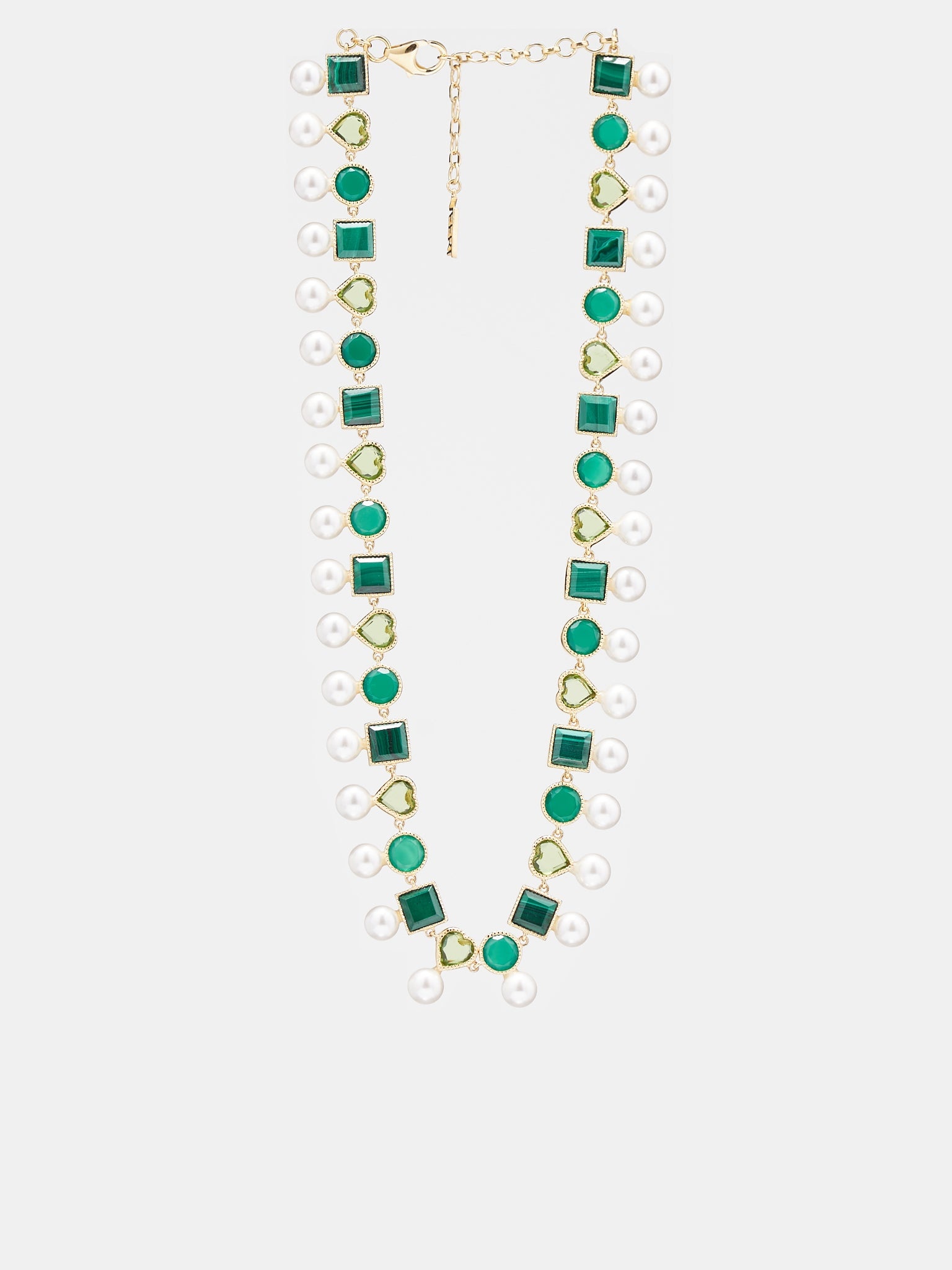 VEERT necklace in gold & green, handmade, beaded style, sterling silver & yellow gold construction, bezel-set shape design, onyx & malachite & peridot encrusting, freshwater pearl detailing, logo plaque, lobster claw clasp fastening, adjustable chain length, velvet pouch & box included. Made in US 60% .925 Sterling Silver 20% 18K Yellow Gold Vermeil 10% Freshwater Pearls 10% Green Onyx One Size