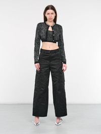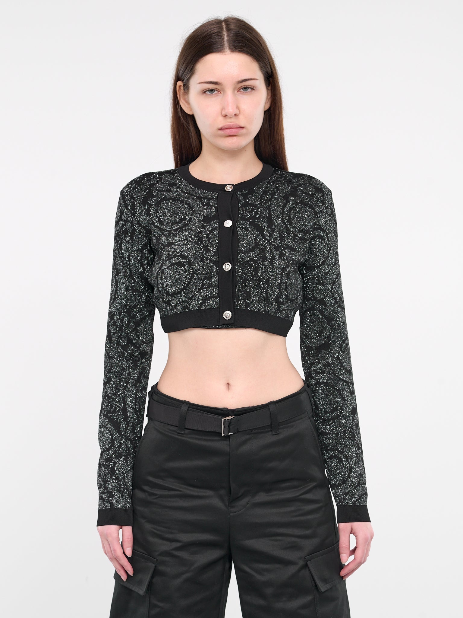 VERSACE sweater in black, cropped cardigan design, stretch viscose-blend, paneled knit construction, lurex Barocco pattern, round neck, front buttoned placket closure, signature Medusa '95 buttons, long sleeves, rib-knit collar & cuffs & placket & hem, straight hemline, cropped length, slim fit. Made in Italy 84% Viscose 7% Nylon 6% Metallized Polyester 3% Elastane Italian Sizing Model is 5'10" wearing size 38. Bust: 33" Waist: 24" Hips: 35"