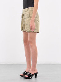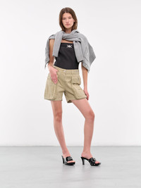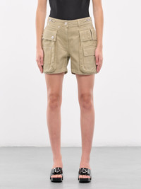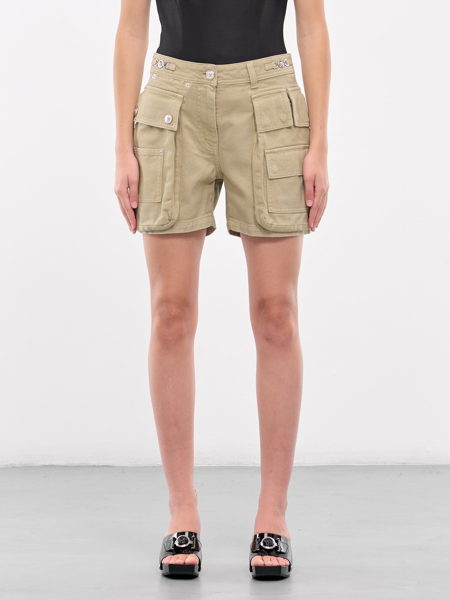 VERSACE shorts in taupe, paneled denim construction, belt loops, back logo patch, Medusa '95 hardware, front button & concealed zip fly closure, side cargo pockets, straight hem, mini-length, slim fit. 100% Cotton Standard Sizing Model is 5'9" wearing size 26. Bust: 33.5" Waist: 25" Hips: 35"