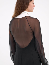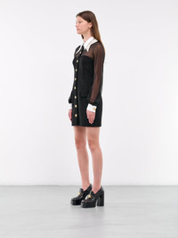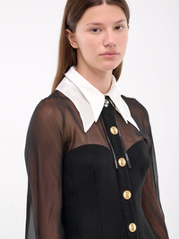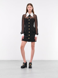 VERSACE dress in black, paneled silk & wool-blend construction, pointed collar, front button placket closure, Medusa '95 hardware, sheer paneling, long sleeves, buttoned barrel cuffs, side flap pockets, straight hem, lined, mini-length, slim fit. Outer 1: 97% Pure Virgin Wool 2% Nylon 1% Elastane Outer 2: 100% Silk Outer 3: 100% Silk Lining: 75% Acetate 25% Silk Trim: 74% Acetate 26% Viscose Italian Sizing Model is 5'9" wearing size 40. Bust: 33.5" Waist: 25" Hips: 35"