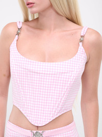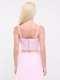 VERSACE top in pink, corset top design, paneled wool construction, check pattern, scoop neck, adjustable spaghetti straps, sleeveless, armscyes, partially open back, back concealed zip closure, corset hem, lined, cropped length, slim fit. Made in Italy Outer: 100% Virgin Wool Inner: 100% Cupro Italian Sizing Model is 5'9" wearing size 38. Bust: 32" Waist: 24" Hips: 34"