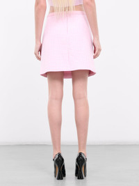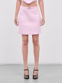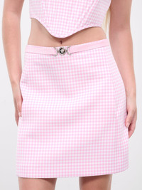 VERSACE skirt in pink, paneled wool construction, check pattern, high-waisted, fitted waist, elastic belt & silver-tone signature Medusa '95 hardware, back concealed zip closure, straight hem, lined, mini-length, slim fit. Made in Italy Outer: 100% Virgin Wool Trim: 74% Acetate 26% Viscose Inner: 100% Cupro Italian Sizing Model is 5'9" wearing size 38. Bust: 32" Waist: 24" Hips: 34"