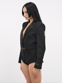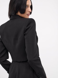 VERSACE jacket in black, blazer design, paneled wool construction, peaked lapel, structured shoulders, long sleeves, surgeon's cuffs, chest welt pocket, front button closure, straight hem, lined, cropped length, tailored fit. Made in Italy Outer: 100% Virgin Wool Inner: 58% Cupro 42% Viscose European Sizing Model is 5'8" wearing size 38. Bust: 32" Waist: 26" Hips: 34.5"