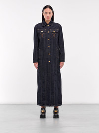 VERSACE coat in indigo, paneled denim construction, contrast topstitching, spread collar, front button placket closure, signature Medusa '95 hardware, long sleeves, chest buttoned flap pockets, side welt pockets, straight hem, back vent, straight hem, maxi-length, relaxed fit. 100% Cotton Italian Sizing Model is 5'6" wearing size 38. Bust: 31" Waist: 24" Hips: 34"