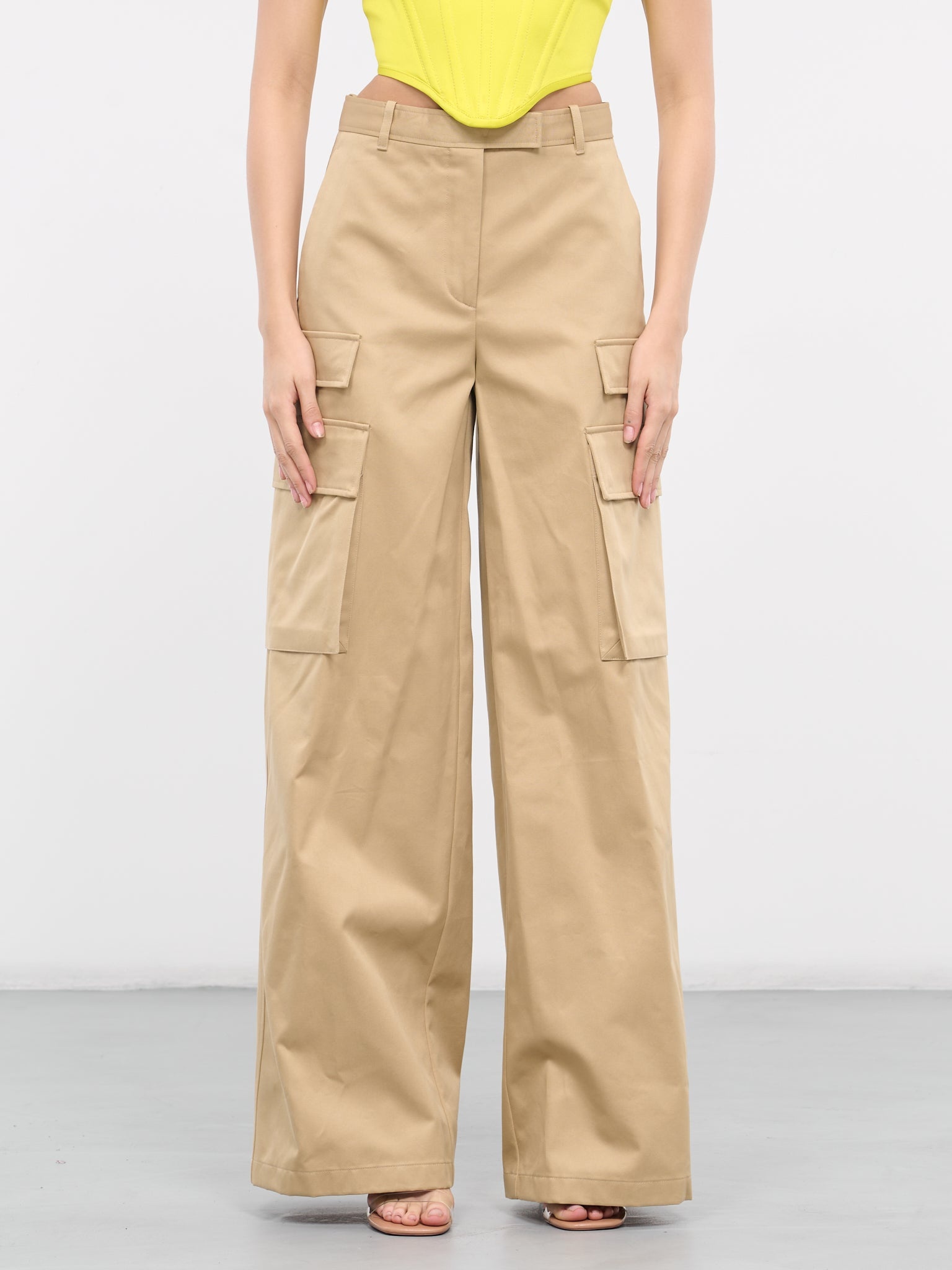 VERSACE trousers in beige, technical utilitarian cargo design, paneled cotton gabardine construction, high-waisted, belt loops, front concealed hook-eye & zip fly, inset pockets, back welt pockets, side cargo pockets, pocket logo patch, lined, wide leg, baggy fit. Made in Italy Outer: 100% Cotton Inner: 100% Cupro Italian Sizing Model is 5'8" wearing size 38. Bust: 32" Waist: 26" Hips: 34.5"