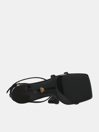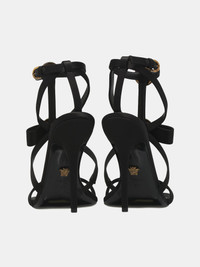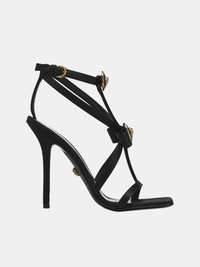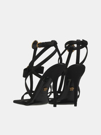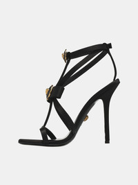 VERSACE heels in black, satin & leather construction, open strap design, wraparound straps & adjustable pin-buckle strap, signature Medusa hardware, squared toe, stiletto heel, leather heel. Made in Italy Outer: 72% Viscose 28% Silk Lining 1: 100% Lambskin Lining 2: 100% Goat Leather Trim: 100% Lambskin Sole: 100% Calf Leather European Sizing