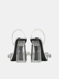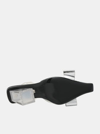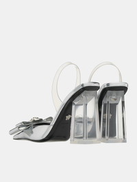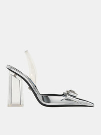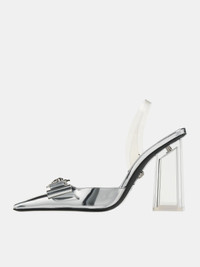 VERSACE heels in silver, mixed leather construction, slingback design, transparent block heel, pointed square toe, branded footbed, signature Medusa hardware, vamp bow detailing, leather sole. Made in Italy Outer: 100% Calf Leather Lining: 100% Goat Leather Lining 2: 100% Lambskin Sole: 100% Calf Leather Trim: 100% Polyurethane European Sizing