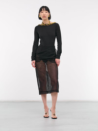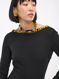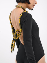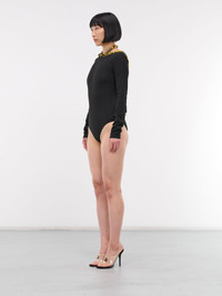 VERSACE bodysuit in black, paneled viscose construction, halterneck, La Coupe Des Dieux print, silver-tone twist & lock closure, logo engraving, low back, long sleeves, low-cut, lined, form fit. Outer: 97% Viscose 3% Elastane Inner: 91% Silk 9% Elastane Trim: 100% Silk European Sizing Model is 5'9" wearing size 38. Bust: 30" Waist: 23" Hips: 35"