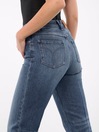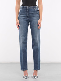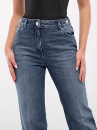 VERSACE pants in blue, paneled denim construction, medium wash, fading & whiskering, mid-waist, belt loops, back logo patch, silver-tone signature Medusa '95 hardware, front button & concealed zip fly closure, inset pockets, coin pocket, back patch pockets, traveler's crease, lined, tapered leg, slim fit. Outer: 100% Cotton Inner: 65% Polyester 35% Cotton Trim: 100% Leather Standard Sizing Model is 5'10" wearing size 26. Bust: 33" Waist: 23.5" Hips: 35.5"