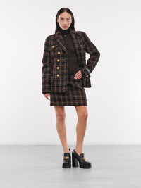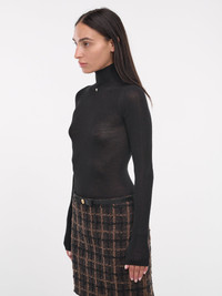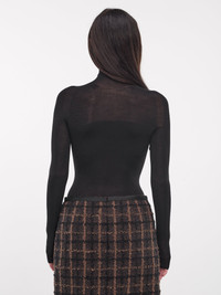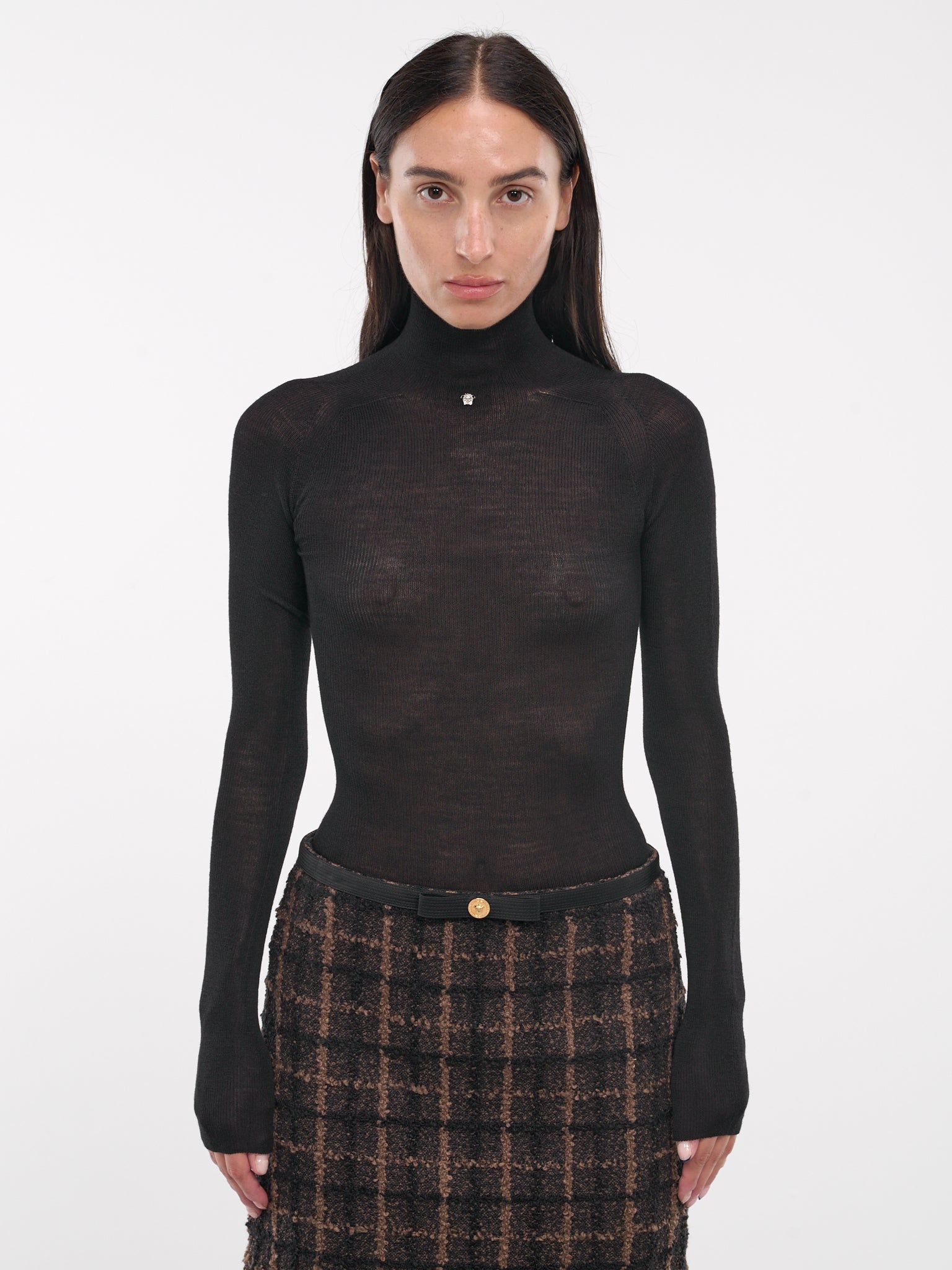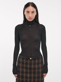 VERSACE turtleneck in black, paneled wool knit construction, rib-knit, turtleneck, silver-tone Medusa metal plaque, long sleeves, straight hem, slim fit. Made in Italy 100% Wool European Sizing Model is 5'6" wearing size 38. Bust: 31" Waist: 24" Hips: 34"