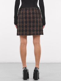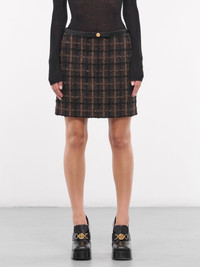 VERSACE skirt in black & brown, paneled construction, plaid pattern, boucle texture, mid-waist, elastic band, gold-tone Medusa metal plaque, straight hem, mini-length, slim fit. Made in Italy 100% Wool European Sizing Model is 5'6" wearing size 40. Bust: 31" Waist: 24" Hips: 34"