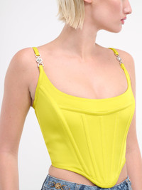 VERSACE top in yellow, paneled acetate-viscose construction, shiny finish, scoop neck, adjustable spaghetti straps, sleeveless, strap metal logo plaque, back exposed zip closure, dipped hem, cropped length, slim fit. Made in Italy 74% Acetate 26% Viscose Italian Sizing Model is 5'9" wearing size 38. Bust: 32" Waist: 24" Hips: 34"