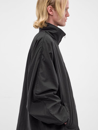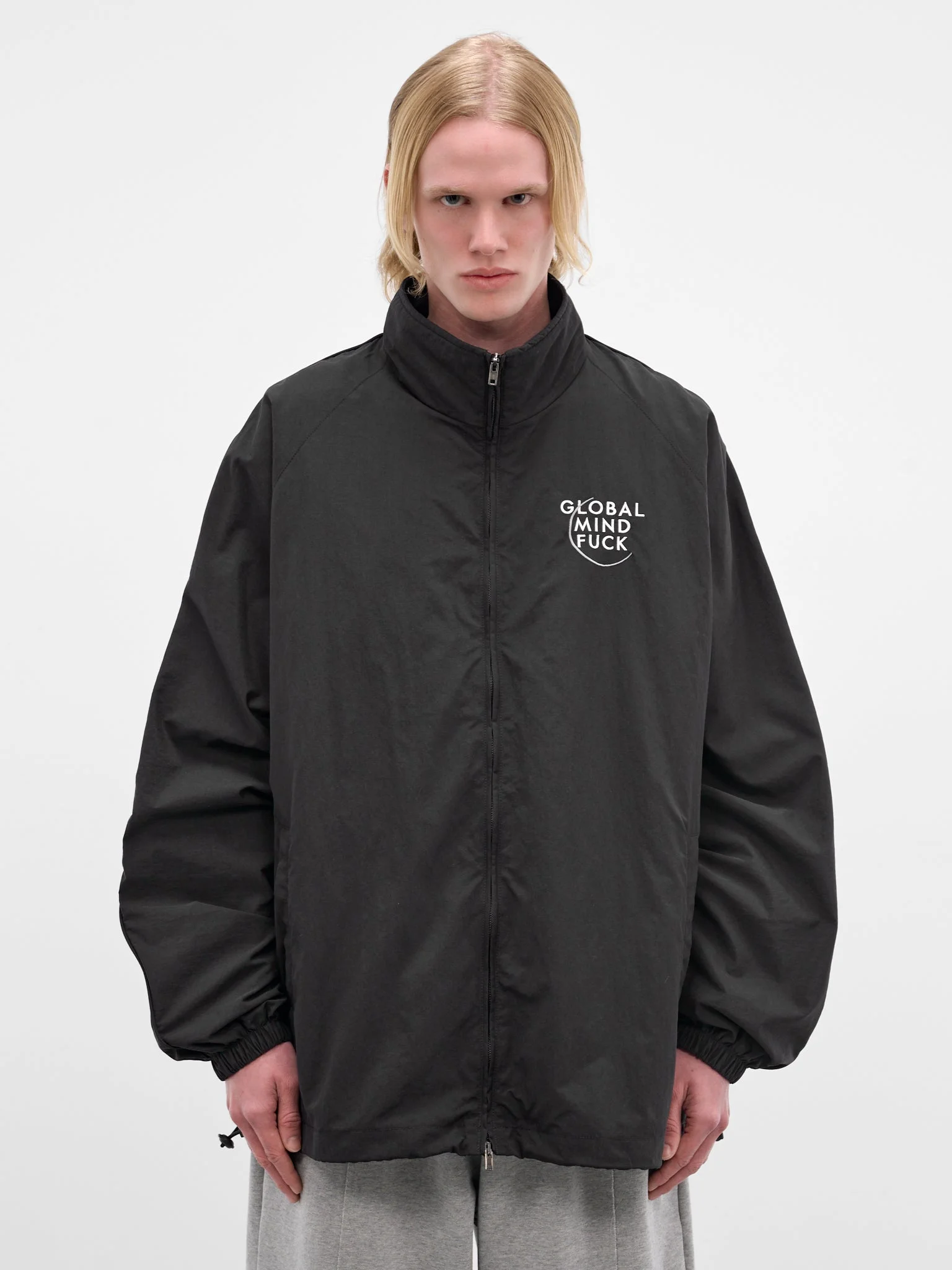 Black nylon jacket with raglan sleeves and 'global mind fuck' embroidery at chest. Featuring: • Oversized fit • Stand collar • Two-way zip closure • Raglan long sleeves with elasticated cuffs • 'Global mind fuck' embroidery at chest • Side pockets and bungee drawstring at hem • Made in Italy • 100% Nylon • Standard sizing Model is 6'0" wearing size M. Shoulders: 19" Chest: 35" Waist: 28"