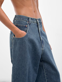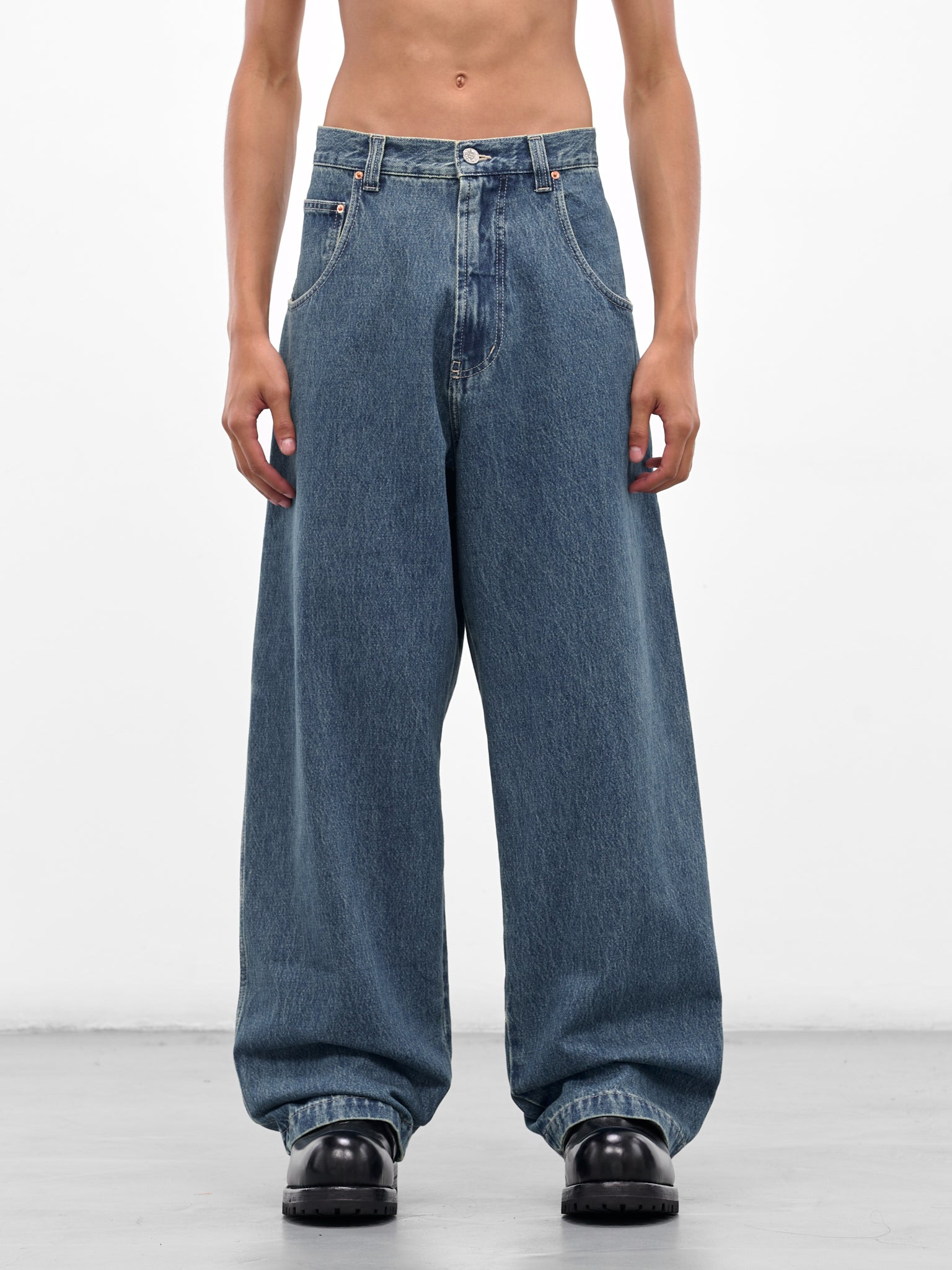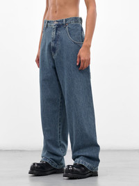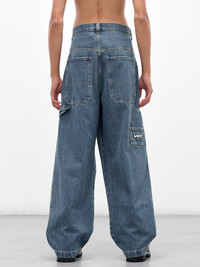 Vintage blue denim jeans feature a faded finish and hammer loop, blending utility details with a straight, non-stretch silhouette. Patch pockets and a logo patch at the outseam further the reinforced, hip-hop-influenced workwear aesthetic. Featuring: • Baggy fit and wide leg • Non-stretch denim with fading throughout • Belt loops with zip fly • Five-pocket styling and patch pockets • Hammer loop and logo patch at outseam • Made in Italy • Body: 100% Cotton | Trim: 65% Polyester 35% Cotton • Standard sizing Model is 5'11.5" wearing size 32. Shoulders: 18" Chest: 36" Waist: 30"