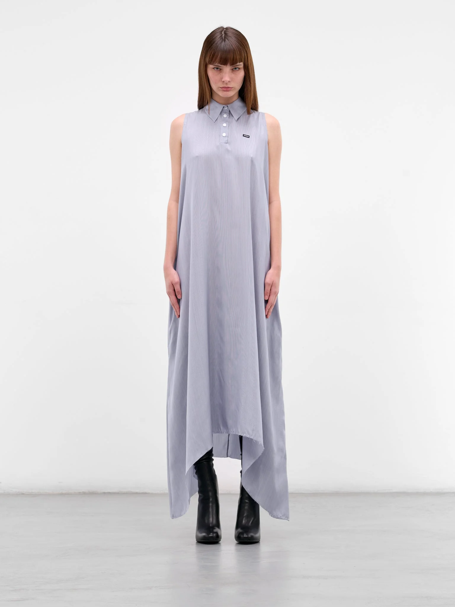 Gray silk dress with pointed collar and asymmetric hemline. Featuring: • Relaxed fit • Maxi length • Pointed collar • Front quarter button placket closure • Sleeveless with armholes • Chest logo embroidery • Raw hem and asymmetric hemline • Made in Italy • 100% Silk • Standard sizing Model is 5'7" wearing size S. Bust: 30" Waist: 22" Hips: 33"