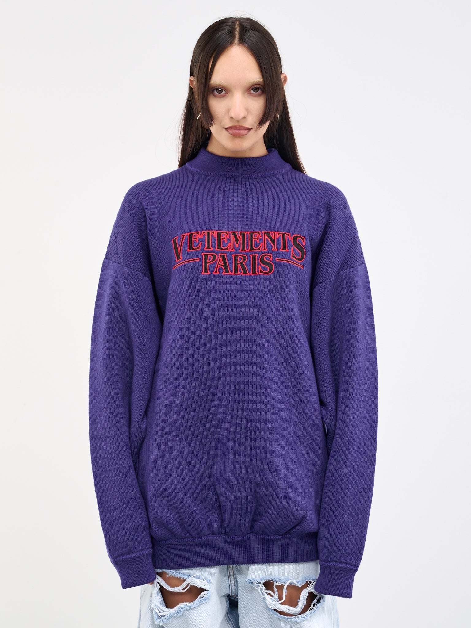 VETEMENTS sweater in purple, oversized silhouette, knit construction, embroidered logo patch, crewneck, drop shoulder, elongated sleeves, ribbed elasticized trim, relaxed fit. Made in Italy Standard Sizing Model is 5'8" wearing size S. Bust: 32" Waist: 26" Hips: 34.5"