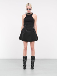 VETEMENTS skirt in black, reconstructed skirt design, paneled stretch wool construction, high-waisted, fitted waist, ruched waist & raw hem detailing, front wrap-style button fastening, side welted flap pockets, straight hem, mini-length, regular fit. Made in Italy 93% Wool 7% Elastane Standard Sizing Model is 5'9" wearing size XS. Bust: 32" Waist: 24" Hips: 34"