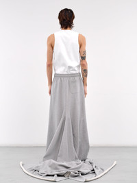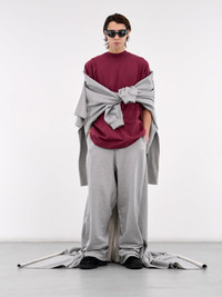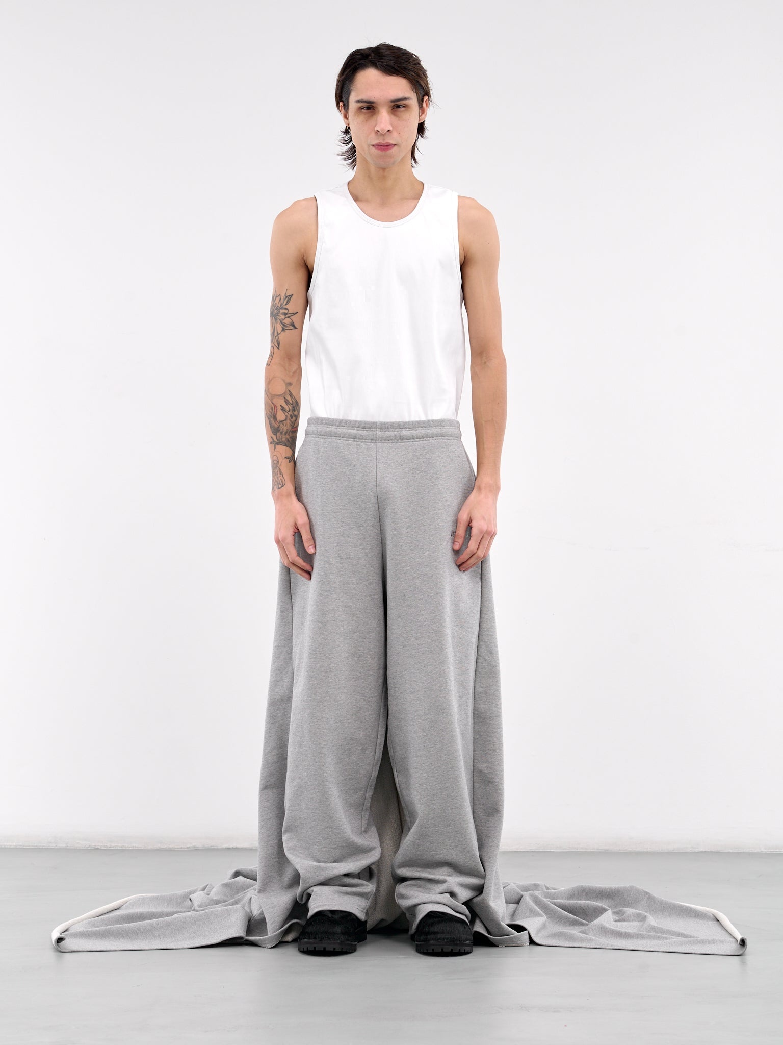 VETEMENTS joggers in grey, paneled cotton construction, elasticated waistband, inset pockets, back patch pocket & logo embroidery, side logo embroidery, back long train, wide leg, relaxed fit. Made in Portugal 80% Cotton 20% Polyester Standard Sizing Model is 6'1” and wears a size S. Shoulders: 17” Chest: 33” Waist: 30”