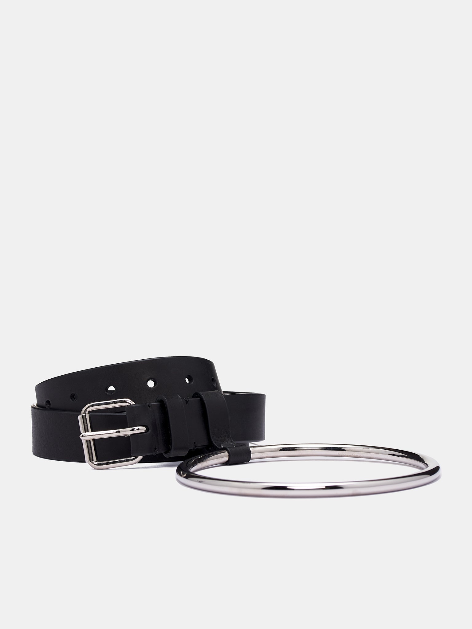 VETEMENTS belt in black & silver, leather construction, adjustable pin-buckle fastening, oversized ring embellishment, embossed logo. Made in Italy Belt: 100% Leather Application: 100% Brass One Size
