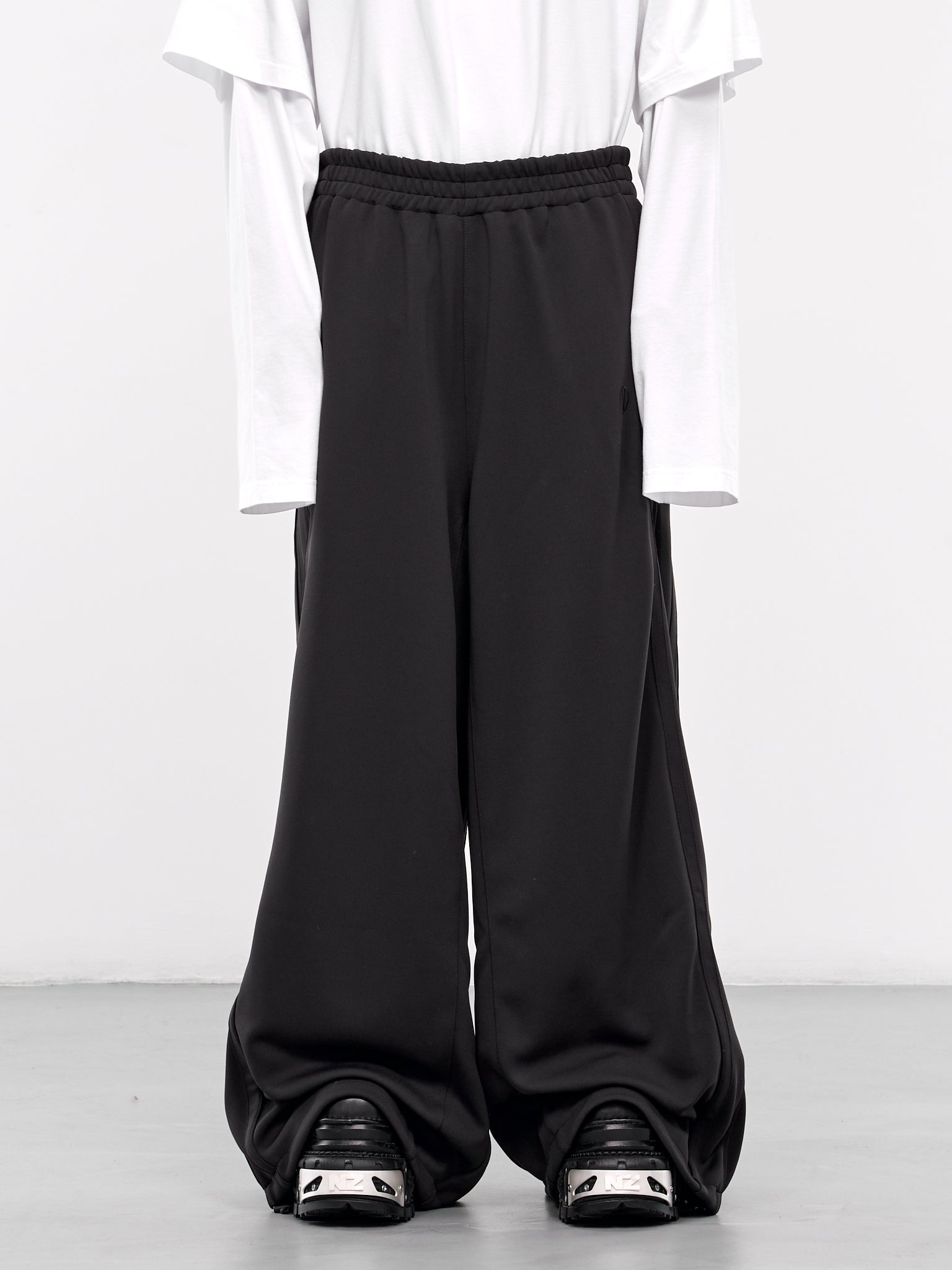 VETEMENTS joggers in black, paneled poly construction, elasticated waistband, side piping, wide leg, baggy fit. Made in Italy 100% Polyester Standard Sizing Model is 6'1" wearing size S. Shoulders: 18" Chest: 36" Waist: 28"
