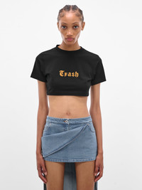 A black cropped t-shirt embroidered with 'Trash' in a gothic font and rendered with Vetements' signature playful irony. Featuring: • Slim fit • Crewneck • 'Trash' embroidered graphic • Short sleeves • Straight hem • Cropped length • Made in Portugal • 90% Cotton 10% Lyocell • Standard sizing Model is 5'9.5" wearing size S. Bust: 30" Waist: 23" Hips: 33"