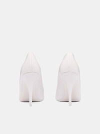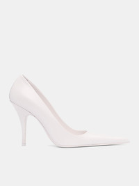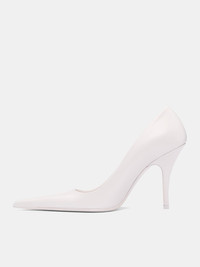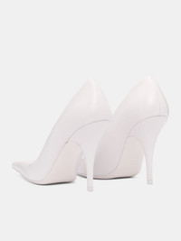 A pair of white pumps crafted in a soft, full-grain leather with Vetements' signature exaggerated silhouette. The heels are finished with an elongated, pointe toe, stiletto heel, and logo detailing. These versatile pumps are a reinterpretation of a classic through the lens of Vetements. Featuring: • Low-cut and slip-on style • Stiletto heel • Elongated, sharp, pointed toe • Debossed logo at sole • Leathing lining • Made in Italy • 100% Leather • Italian Sizing