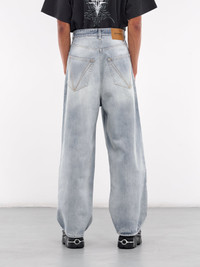 VETEMENTS jeans in blue, paneled denim construction, light wash, belt loops, back logo patch, front button & concealed zip fly closure, inset pockets, coin pocket, back patch pockets, wide leg, baggy fit. Standard Sizing Model is 6'2" wearing size 30. Shoulders: 19" Chest: 38" Waist: 29"
