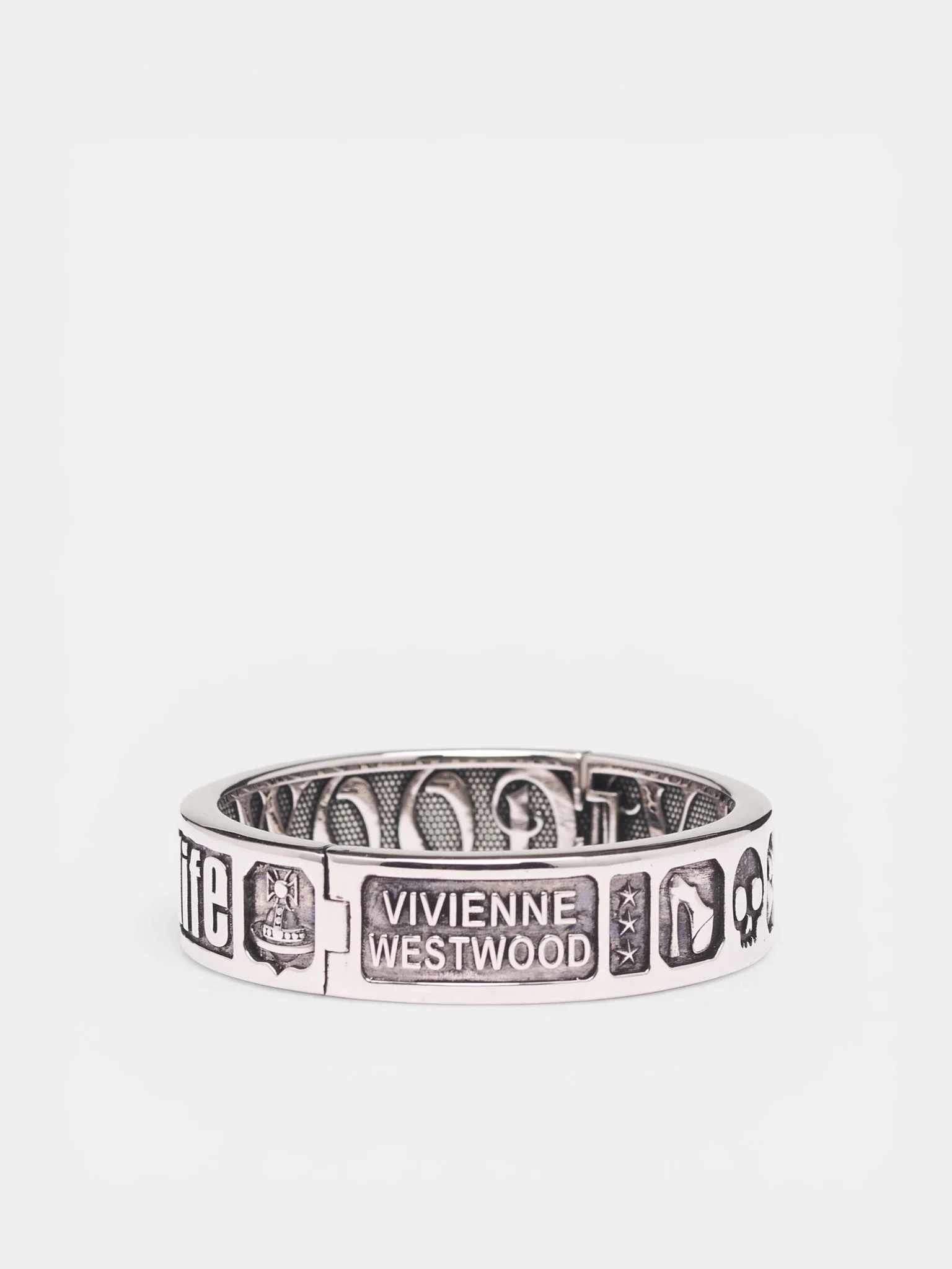 Victorine bangle in silver with a brass construction, featuring engraved logo and graphic detailing. Featuring: • Brass construction • Engraved logo and graphics • Clasp closure • Made in Thailand • 100% Brass • One size