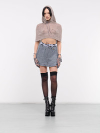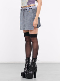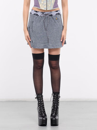 VIVIENNE WESTWOOD skirt in blue & grey, paneled knit linen construction, tweed knit, graphic adjustable drawstring waistband, front logo embroidery, pleating, back patch pockets, straight hem, mini-length, Made in Italy 100% Linen Standard Sizing Model is 5'8" wearing size S. Bust: 32" Waist: 26" Hips: 34.5"