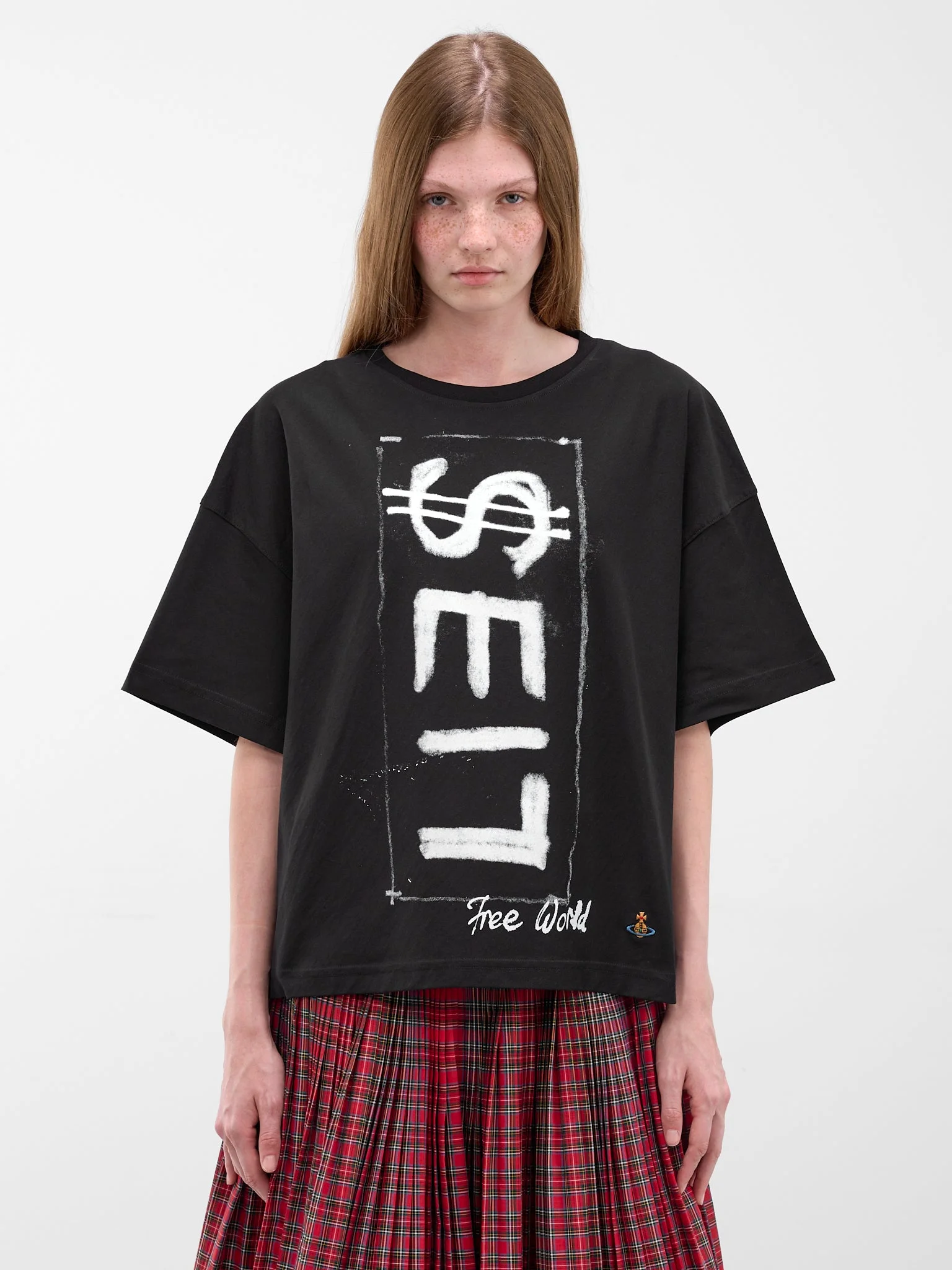 T-shirt in black shaped in an oversized boxy silhouette and constructed in cotton with a Lies graphic print and orb embroidery at the hem. Featuring: • Oversized boxy fit • Crewneck • Dropped shoulders • Short sleeves • Lies graphic print • Orb embroidery at hem • Made in Tunisia • 100% Cotton • Standard sizing Model is 5'8" wearing size S. Bust: 29” Waist: 23” Hips: 33.5”