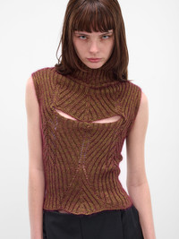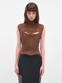 This brown Mary corset top in a silk-mohair blend explores texture with herringbone and rib-knit stitches, while the high neckline and structured cropped design set a sharply sculpted tone. The horizontal chest slit reveals a corset-style underlay for support. Featuring: • Slim fit • High neckline with ribbed details • Sleeveless cropped silhouette • Herringbone and rib-knit construction • Horizontal chest slit with built-in corset bra • Slight stretch and slip-on style • Made in Italy • 66% Silk 27% Mohair 6% Polyamide 1% Elastane • Italian sizing Model is 5'7" wearing size 40. Bust: 30" Waist: 22" Hips: 33"