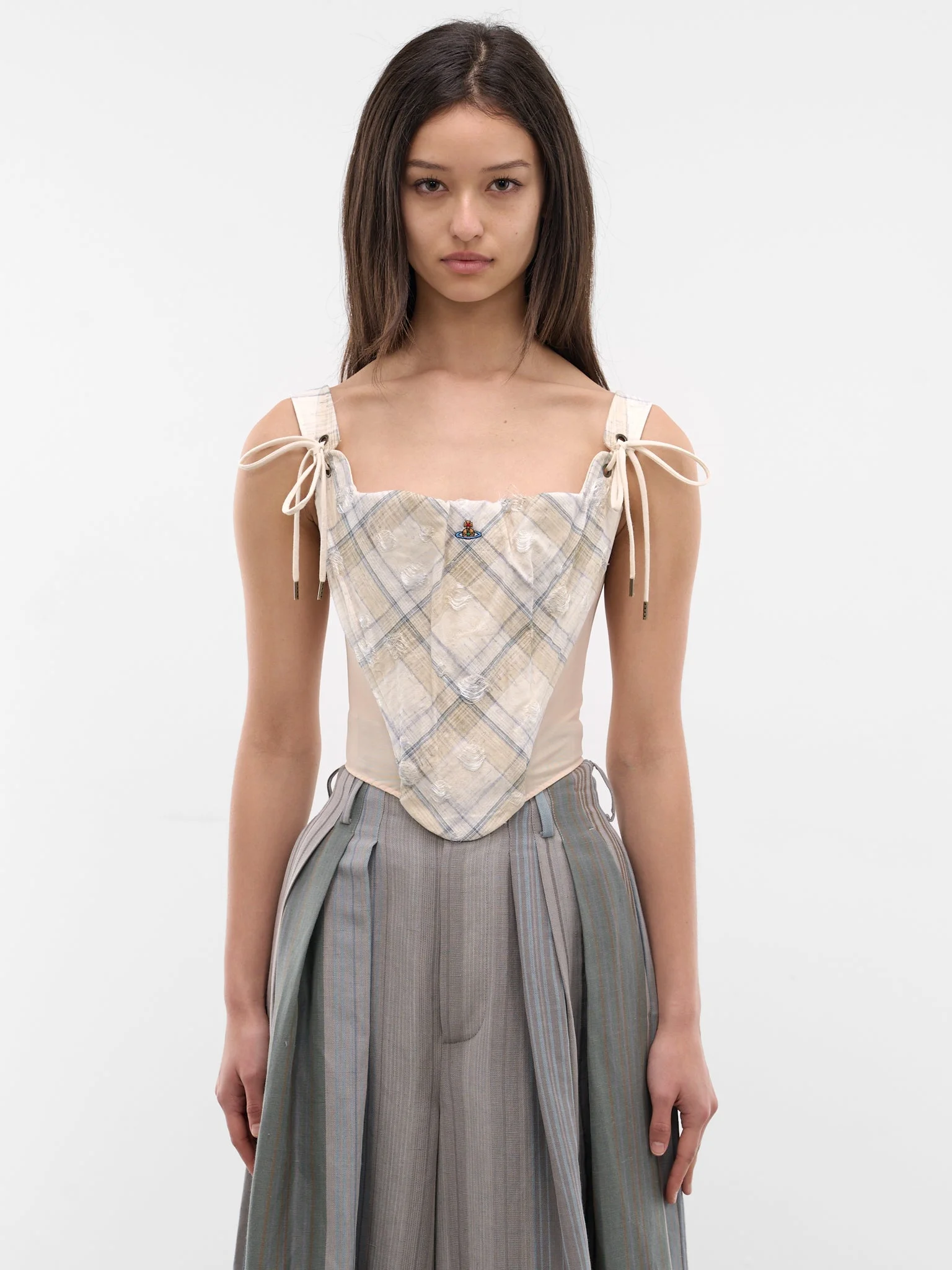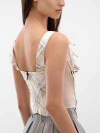 Corset in ecru constructed in linen with Louth tartan motif and structured silhouette. Featuring: • Slim fit • Linen construction • Louth tartan motif • Gathered square neckline • Self-tie shoulder straps • Sheer side panels • Embroidered multi-colour orb at front • Pointed hem • Concealed center-back zip closure • Internal striped lining • Tonal topstitching • Made in Italy • 100% Linen • Italian sizing Model is 5'8.5" wearing size 40. Bust: 32” Waist: 24” Hips: 34”