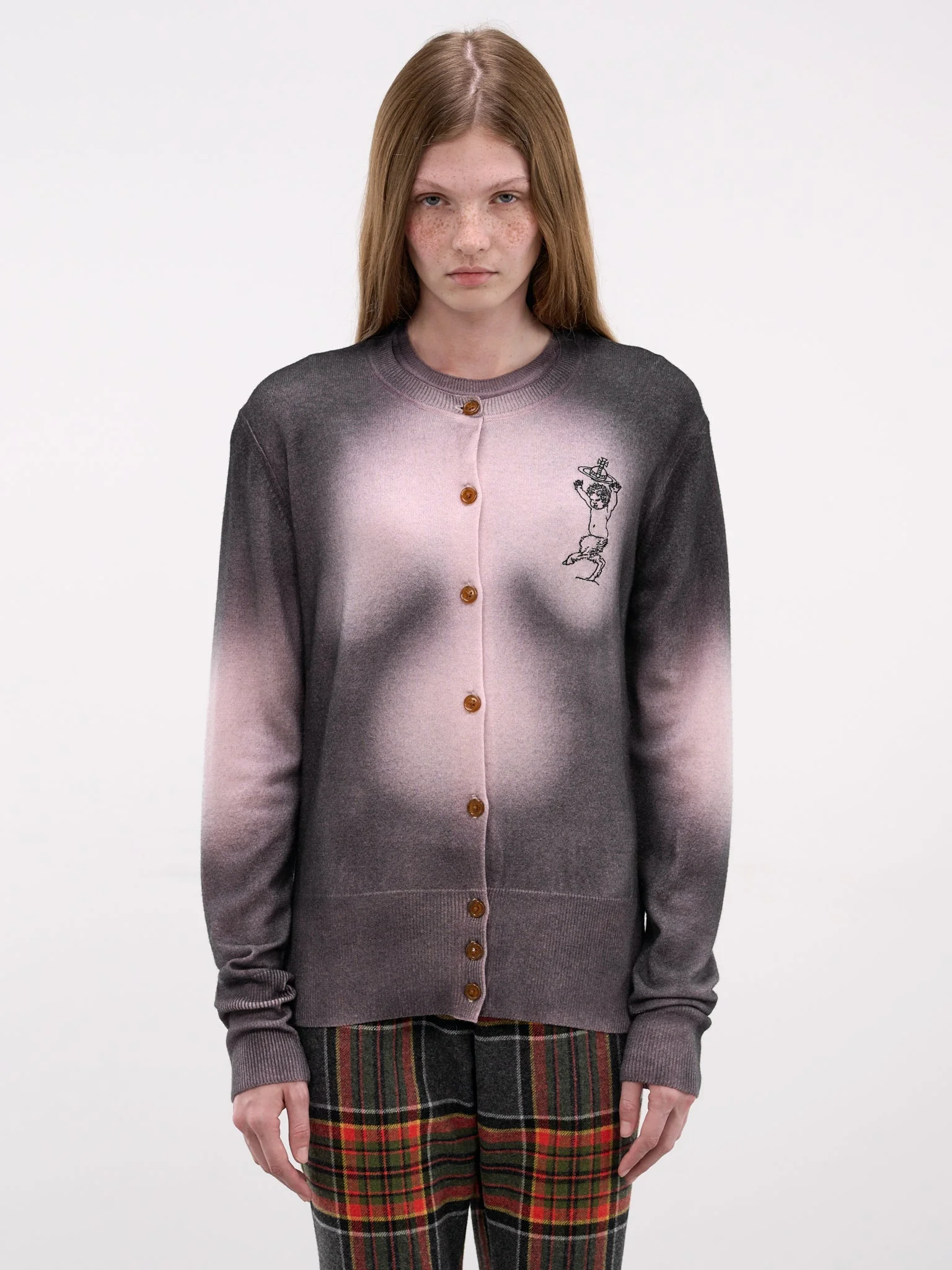 Elle cardigan in black and pink constructed in a wool-cashmere knit with a gradient pattern and orb and satyr graphic at the chest. Featuring: • Slim fit • Ribbed crewneck • Front button placket closure • Long sleeves • Rib-knit cuffs and hem • Gradient pink and black pattern • Orb and satyr graphic at chest • Made in Italy • 90% Wool 10% Cashmere • Standard sizing Model is 5'8" wearing size S. Bust: 29” Waist: 23” Hips: 33.5”