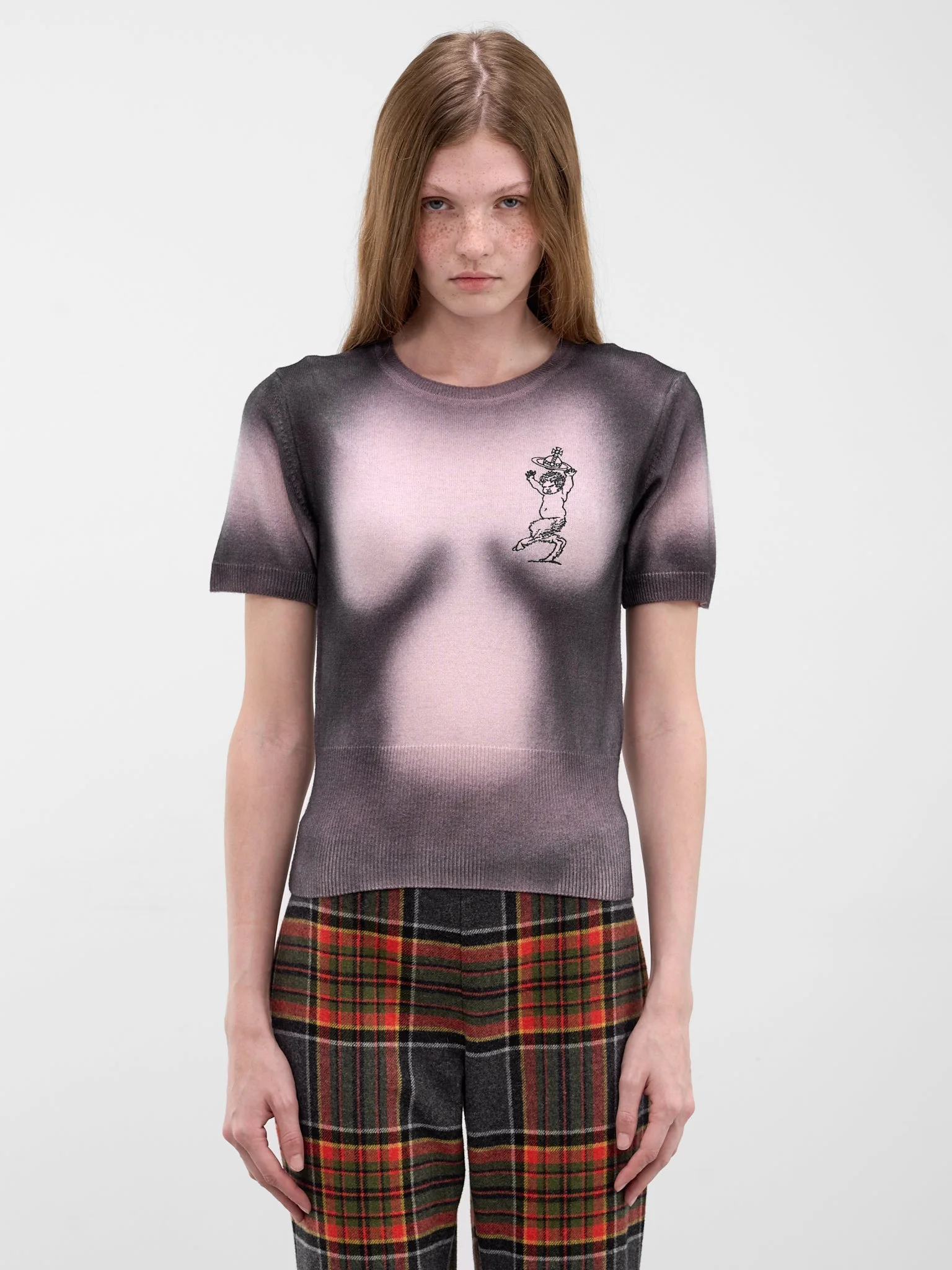 Elle t-shirt in black and pink rendered in a wool-cashmere knit with a gradient pattern and orb and satyr graphic at the chest. Featuring: • Slim fit • Ribbed crewneck • Short sleeves • Rib-knit cuffs and hem • Gradient pink and black pattern • Orb and satyr graphic at chest • Made in Italy • 90% Wool 10% Cashmere • Standard sizing Model is 5'8" wearing size S. Bust: 29” Waist: 23” Hips: 33.5”