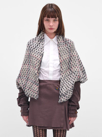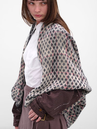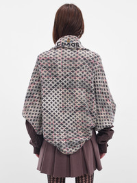 Distressed tartan poncho in grey layers with cross and tartan check patterns for a graphic impact, detailed with 'chaos' and orb motif embroidery at the back. The oversized, draped silhouette is finished with a shawl collar for sculptural comfort. Featuring: • Oversized fit • Draped silhouette with shawl collar • Distressed tartan and cross patterns • Back ‘chaos’ and orb embroidery • Made in Italy • 46% Cotton 19% Polyamide 16% Wool 16% Viscose 3% Cashmere • One size Model is 5'7" wearing size S. Bust: 30" Waist: 22" Hips: 33"
