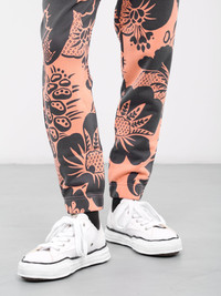 VIVIENNE WESTWOOD orange joggers, sweat jersey, Hawaiian print, mid-elastic waist, adjustable drawcord, side seam pockets, back single patch pocket, elastic cuffs, tapered leg, slim fit. 100% Cotton Standard Sizing Model is 6’1” wearing size M. Shoulders: 19” Chest: 38” Waist: 31”