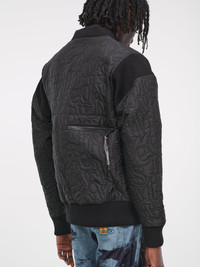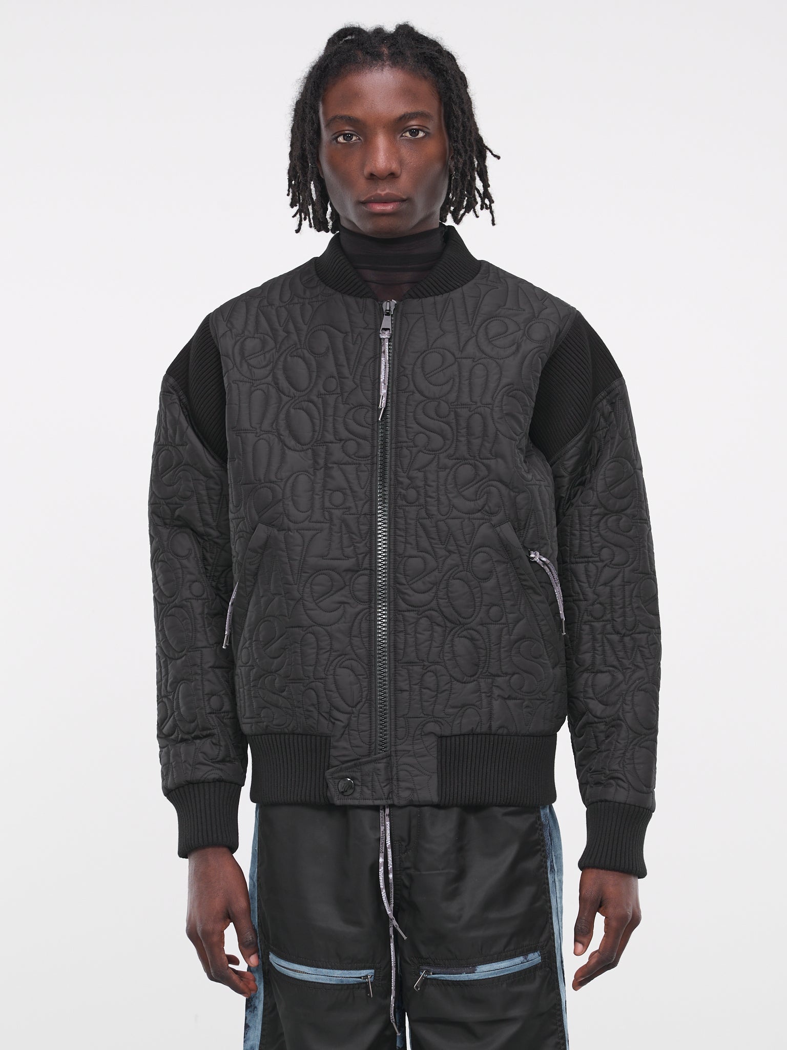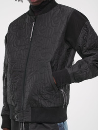 VIVIENNE WESTWOOD black jacket, bomber design, polyester construction, quilted brand lettering, rib knit detailing, stand collar, exposed front zip closure, branded zip pulls, back & side zip pockets, long sleeves, ribbed hem & cuffs, hem button closure, oversized fit. Made in Italy 100% Polyester Standard Sizing Model is 6’2” wearing size M. Shoulders: 19” Chest: 38” Waist: 28”