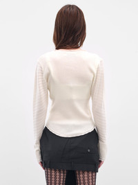 The off-white Maria corset top in white features multi-knit patterning and architectural scalloped hems, anchored by a wide neck and sharp front cut-out. The slim fit, long sleeves, and embroidered side orb motif infuse a sculptural mood. Featuring: • Slim fit • Wide neck and front cut-out • Multi-knit patterning with scalloped hems • Side orb motif embroidery • Long sleeves and curved hemline • Made in Italy • 100% Virgin Wool • Italian sizing Model is 5'7" wearing size 40. Bust: 30" Waist: 22" Hips: 33"