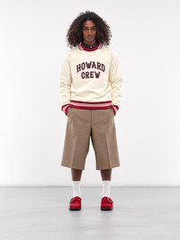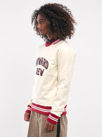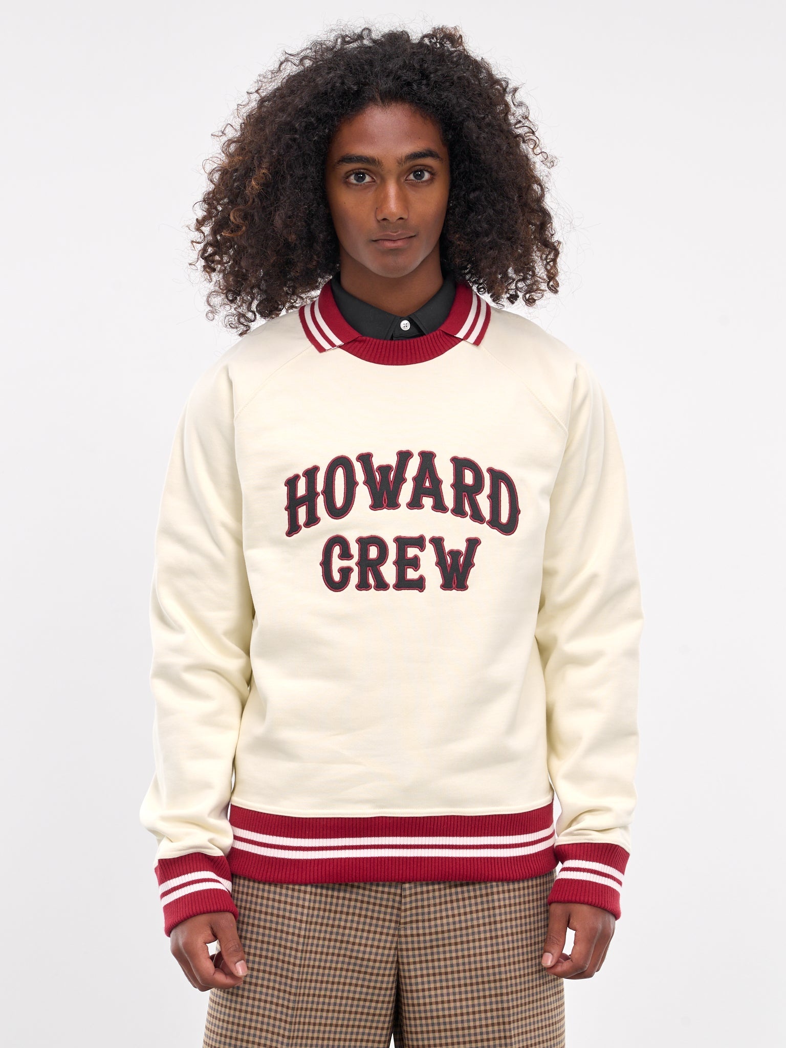 WALES BONNER sweater in ivory & burgundy, paneled cotton construction, ribbed crewneck & spread collar, raglan long sleeves, striped rib-knit cuffs & hem, straight hem, relaxed fit. Made in Portugal Outer: 100% Cotton Trim: 96% Cotton 4% Elastane Standard Sizing Model is 5'11" wearing size M. Shoulders: 18" Chest: 36.5" Waist: 29"